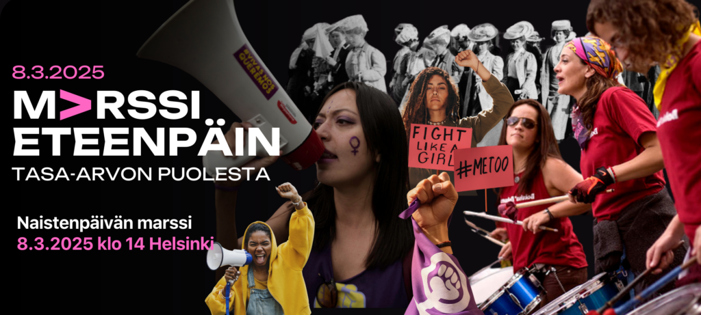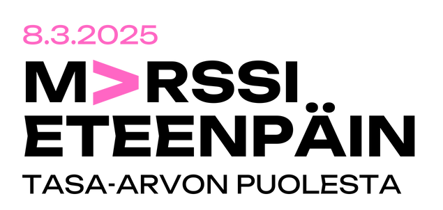 Naistenpäivänä marssimme tasa-arvon ja ihmisoikeuksien puolesta näyttääksemme, millainen massa haluaa Suomen kulkevan tasa-arvotyössä eteenpäin – ei taaksepäin. Ohjelma Senaatintorilla alkaa klo 13, marssi lähtee klo 14. Senaatintori sijaitsee Helsingin Tuomiokirkon edessä. Kannustamme kaikkia pukeutumaan mustaan tai pinkkiin marssin teemavärien mukaisesti.