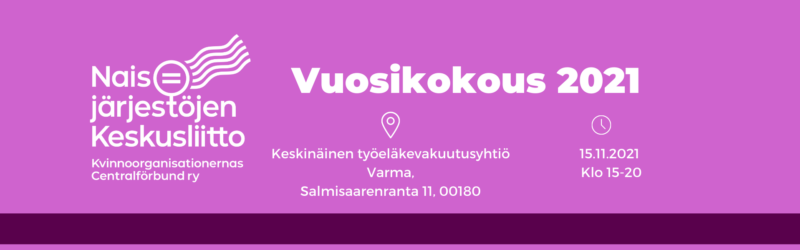 Naisjärjestöjen Keskusliitto – Kvinnoorganisations Centralförbund ry kutsuu jäsenjärjestönsä tämän vuoden vuosikokoukseen maanantaina 15.11.2021 kello 15-20 Keskinäinen työeläkevakuutusyhtiö Varmaan, Salmisaarenranta 11, 00180 Helsinki. Kokoukseen voi osallistua myös etäyhteyden välityksellä. Kokouksessa valitaan Naisjärjestöjen Keskusliitolle hallitus sekä puheenjohtaja kaudelle 2022-2024. Tutustu ehdokkaisiin tarkemmin täällä. Ilmoittautuminen tiistaihin 9.11. mennessä.