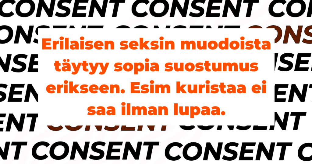 Seksi on turvallista ja kunnioittavaa silloin, kun siihen liittyy kaikkien osapuolten suostumus. Se tarkoittaa, että kaikki mukana olevat ovat samaa mieltä siitä, mitä tehdään ja että suostumus voidaan ilmaista sanoin, elein tai muulla selkeällä tavalla.